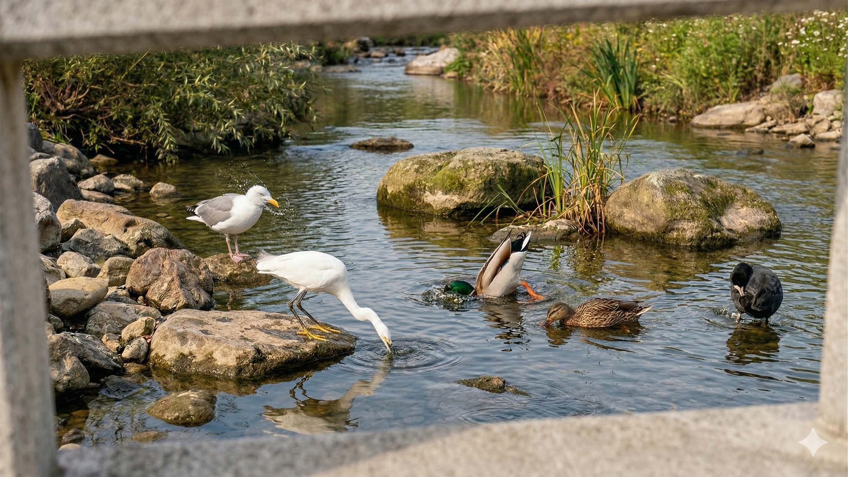 흰색 큰 새는 왜가리나 백로 중 하나인 것 같은데, 솔직히 저는 구분을 잘 못하겠어요. 길고 우아한 목에 하얀 깃털이 너무 고고해 보였어요. 그 자태가 뭔가 고급스러운 느낌 🤍